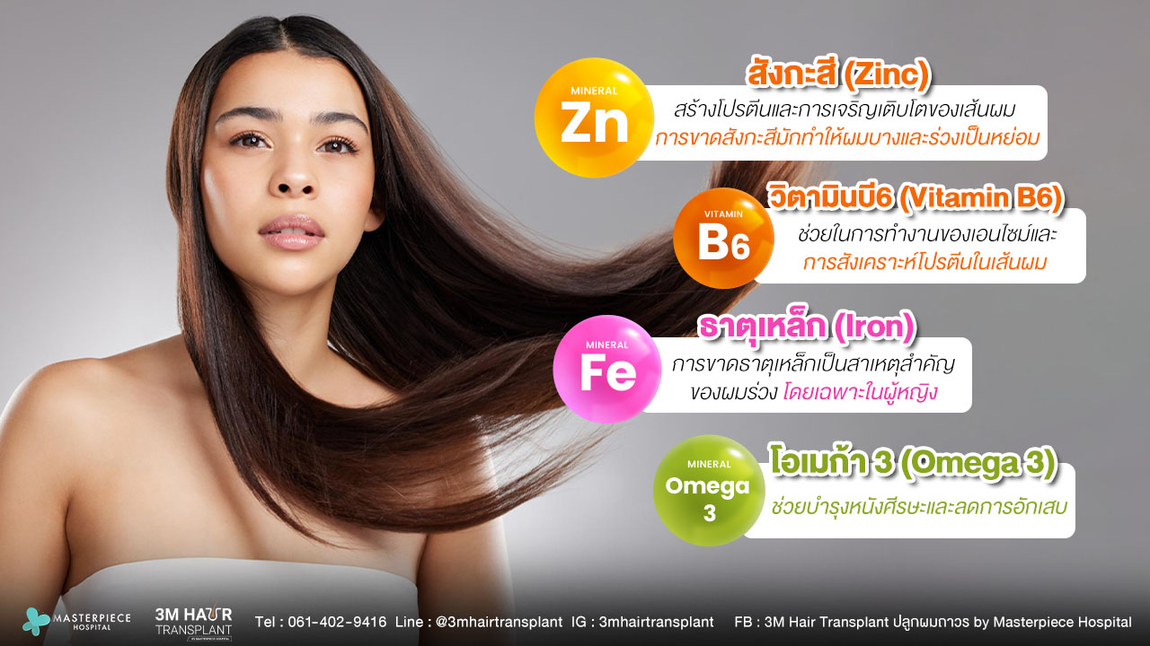 เส้นผมแต่ละเส้นประกอบด้วยโปรตีนที่เรียกว่าเคราติน (keratin) การสร้างเคราตินและวงจรชีวิตของเส้นผมต้องอาศัยสารอาหารต่างๆ เพื่อให้ผมแข็งแรงและเติบโตได้ตามปกติ เมื่อร่างกายขาดวิตามินหรือแร่ธาตุที่จำเป็น กระบวนการเหล่านี้จะหยุดชะงักลง ทำให้ผมอ่อนแอ เปราะขาดง่าย และนำไปสู่ปัญหาผมร่วงได้ในที่สุด