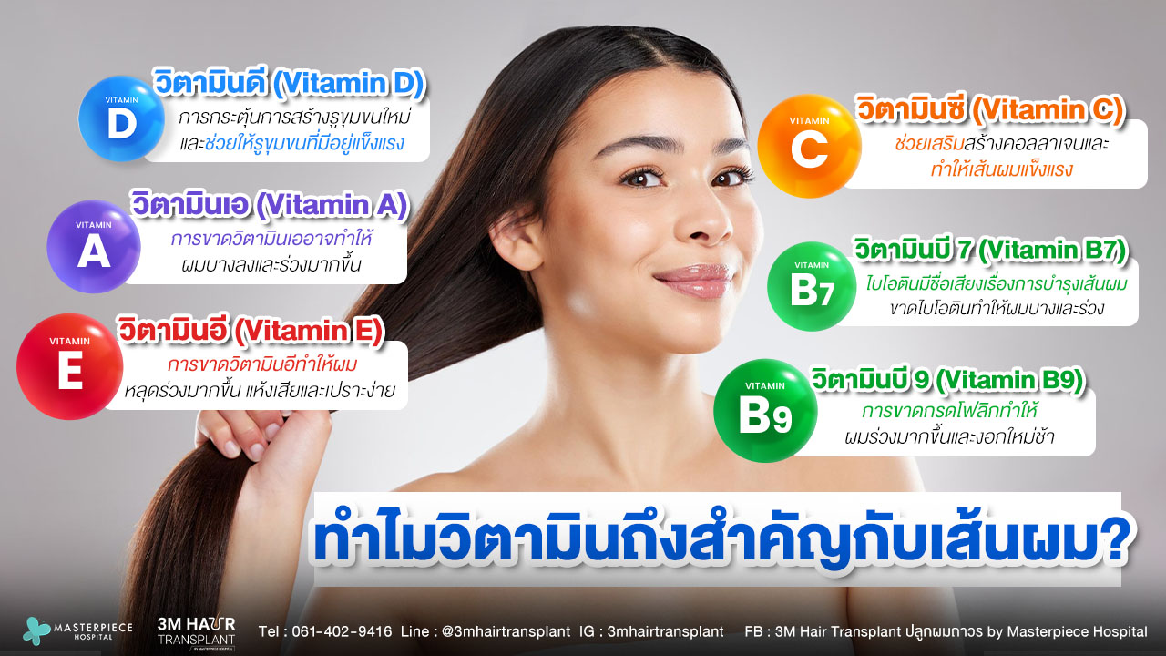 วิตามินมีบทบาทสำคัญในทุกขั้นตอนของวงจรการเจริญเติบโตของเส้นผม วิตามินให้สารอาหารที่เซลล์รูขุมขนต้องการเพื่อการเจริญเติบโตและการทำงานของร่างกายที่แข็งแรง ตัวอย่างเช่น วิตามินช่วยในกระบวนการต่างๆ เช่น การสังเคราะห์โปรตีน ซึ่งจำเป็นต่อการผลิตโปรตีนในเส้นผม วิตามินต้านอนุมูลอิสระช่วยปกป้องเซลล์ผมจากความเครียดออกซิเดชันที่เป็นอันตราย วิตามินบีช่วยในกระบวนการเผาผลาญและการเจริญเติบโตของเซลล์ คุณควรได้รับสารอาหารที่เพียงพอต่อเส้นผมและร่างกายผ่านการรับประทานอาหารที่สมดุล